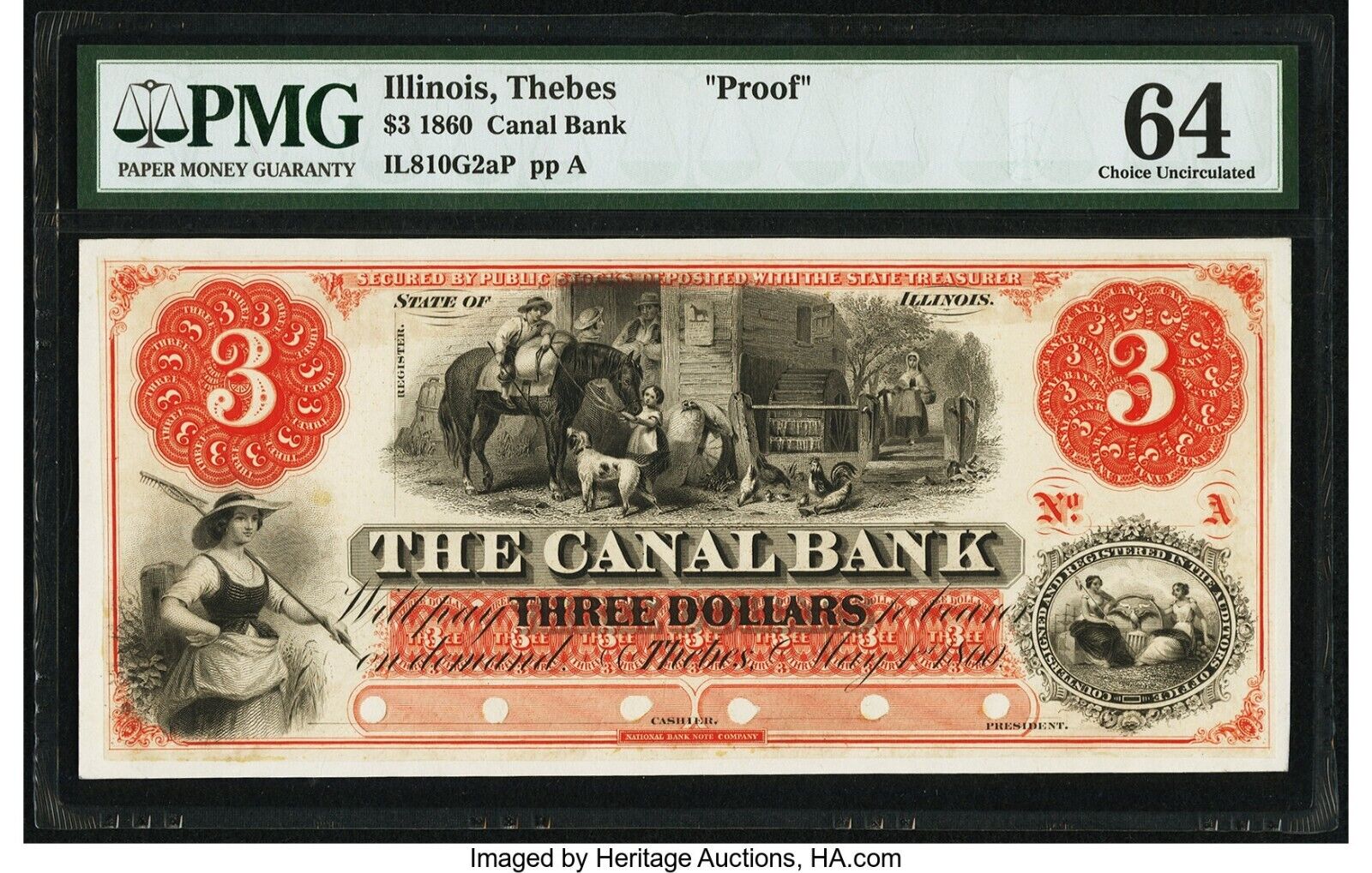 Thebes, IL Canal Bank $3 May 1, 1860 G2a Proof PMG Choice Uncirculated 64